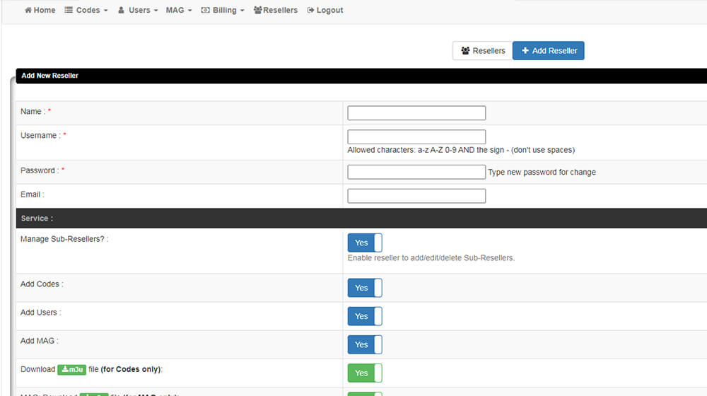 You`ll get a IPTV control panel for lifetime if become our Reseller. Manage Sub-Reseller panel , users Status , expired date, edit users codes etc. We also provide unlimited free trial codes regularly.